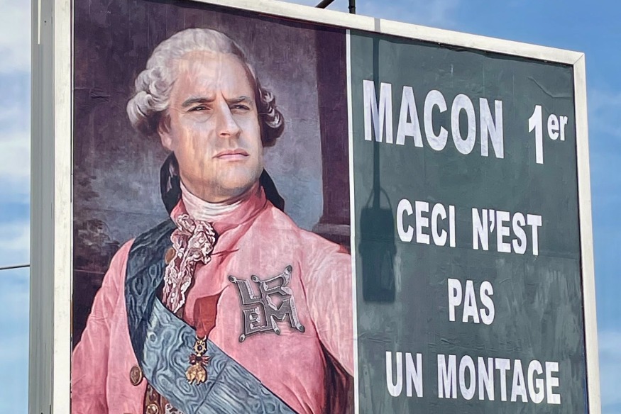 Cette fois, c’est sous les traits d’un monarque français que le président de la République apparaît. On peut lire à côté : "Macon 1er" "ceci n'est pas un montage". L'afficheur varois a en fait réagi sur twitter à la plainte qu'a déposé Emmanuel Macron pour sa précédente affiche où il l'avait representé sous les traits d'Adolf......