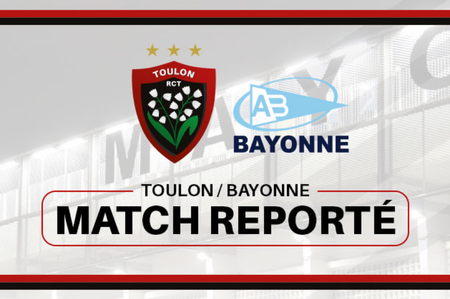 Le match RCT-Bayonne est bien reporté. La rencontre attendue vendredi à Mayol n'aura pas lieu. La nouvelle date reste encore à définir. L'Aviron Bayonnais a refusé de jouer dimanche, faute de temps suffidant pour se préparer. Le club est fermé pour cause de Covid-19 et ne devrait rouvrir que demain.