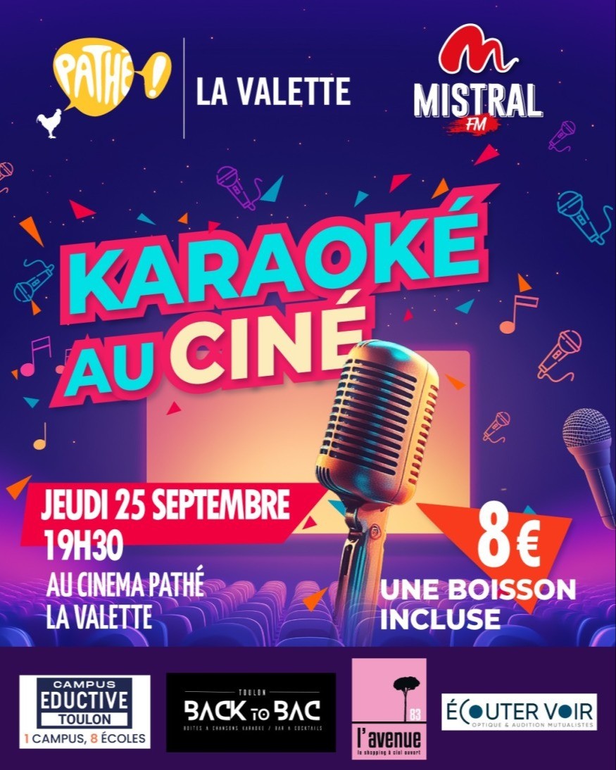 Jeudi 25 septembre dès 19H30, Mistral FM et le cinéma Pathé La Valette vous proposent une soirée unique : chanter sur écran XXL avec un son digne des plus grands films !