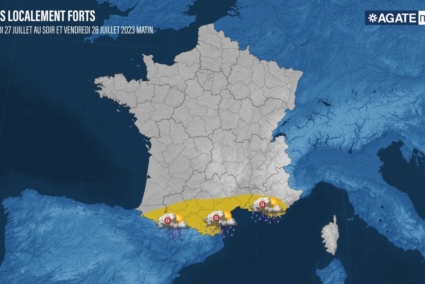 Les départements qui entrent en vigilance orange sont les suivants : Vaucluse, Var, Alpes-de-Haute-Provence, Haute Corse, Corse du Sud, Pyrénées Orientales et Andorre.