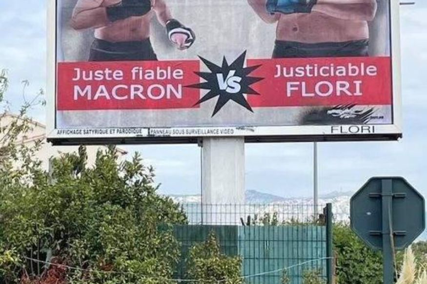 Pour la première fois, il s'est représenté lui-même face au président de la République dans ce qui semble être combat de boxe. D'ailleurs, le panneau indique la date et le lieu de la rencontre : le 17 septembre au tribunal de Toulon. Une référence à sa convocation face à la justice après la plainte déposée par le chef de l'État.