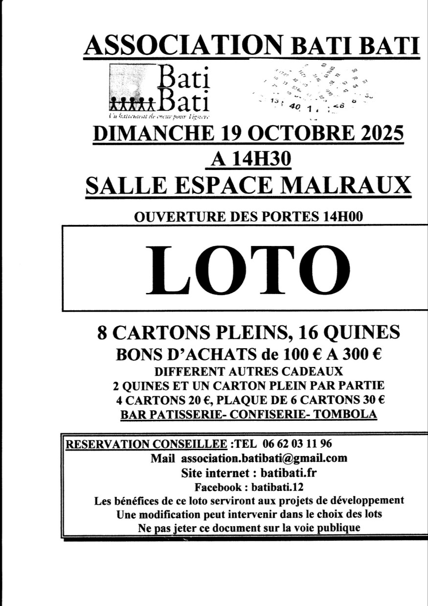 L'association BATI BATI fait son loto le 19 octobre Salle espace Malraux